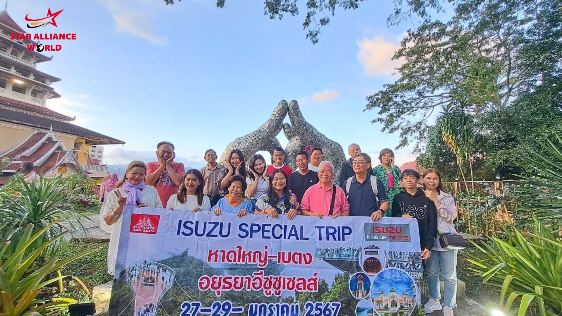 หาดใหญ่ เบตง ทะเลหมอกอัยเยอร์เวง 3 วัน 2 คืน ทางบริษัทสตาร์อัลไลแอนซ์เวิลด์ ยินดีเป็นอย่างยิ่งที่ได้รับความไว้วางใจจากทางบริษัทอยุธยาอีซูซุเซลล์ จัดทริปท่องเที่ยวสุดพิเศษให้กับลูกค้า VIP ของทางบริษัทอยุธยาอีซูซุเซลล์ สำหรับการบริการตลอดทริปนี้ ไม่ว่าจะเป็นร้านอาหาร สถานที่ท่องเที่ยวต่าง ๆ การเดินทาง ที่พัก รวมถึงหัวหน้าทัวร์ล้วนแล้วแต่ผ่านการคัดสรรมาเป็นอย่างดี เพื่อให้ได้มาซึ่งสิ่งที่ดีที่สุดสำหรับลูกค้า ในโอกาสหน้าหวังเป็นอย่างยิ่งว่าทางเราจะได้รับใช้ทุกท่านอีกครั้ง ขอขอบพระคุณค่ะ